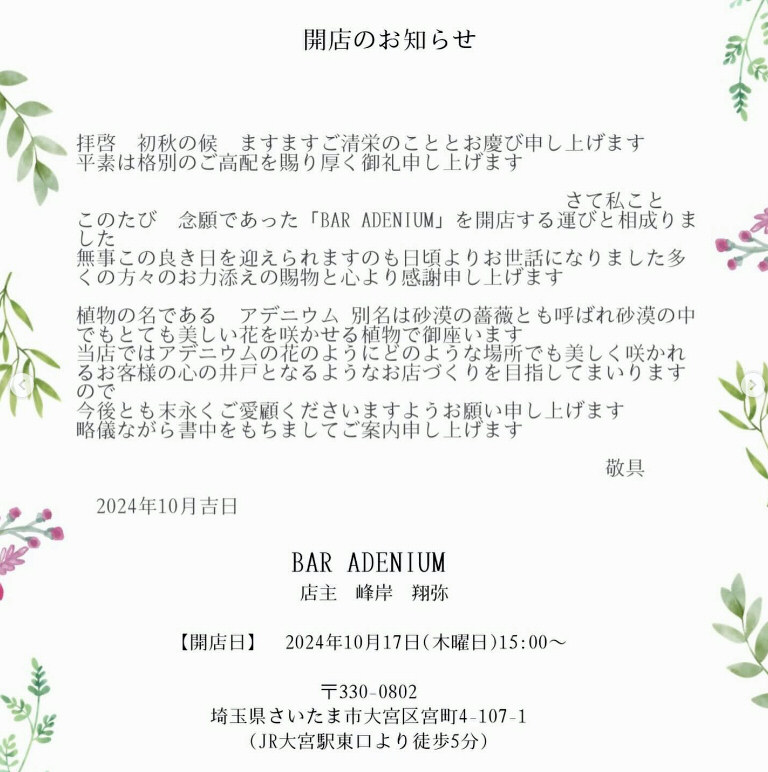 バー・アデニウムは、2024/10/17 大宮区宮町にオープンしたカクテルバーです。